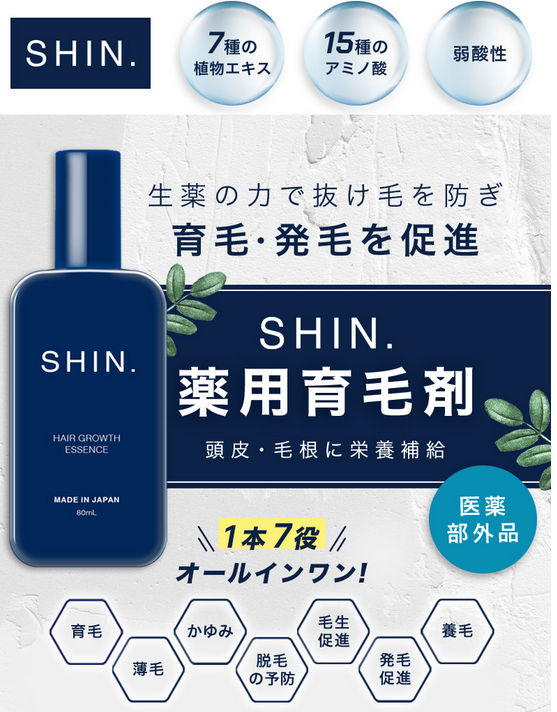 | SHIN. | 頭皮環境を整えつつ育毛をサポート | シャンプー+薬用育毛剤 | アミノ酸系+植物由来 | 刺激を抑えた設計 | 2ステップ | ベタつきにくく穏やか | 将来対策を始めたい男性 | 中 | やや中 | 4.4 |