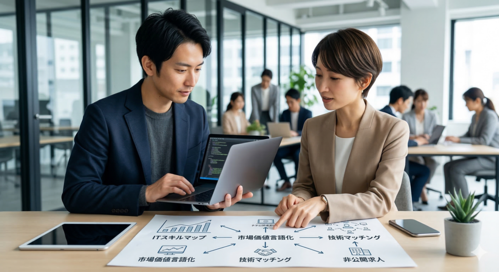 「技術の翻訳者」としての特化型エージェント 経験者向けの転職で最も重要なのは、「あなたのスキルが、その企業のどのビジネス課題を解決できるか」を言語化することです。IT特化型エージェントの担当者は、日頃からエンジニアと対話し、最新の技術トレンドを追い続けています。 彼らはあなたの経歴書を読み込み、「このプロジェクトでの役割なら、A社の現在のレガシー刷新プロジェクトでテックリードとして即戦力になれる」といった具体的な市場価値を見出します。そして、それを企業の人事や現場マネージャーに刺さる言葉で伝えてくれるのです。いわば、あなたのスキルを企業が欲しがる「ソリューション」に翻訳して届ける役割を果たします。
