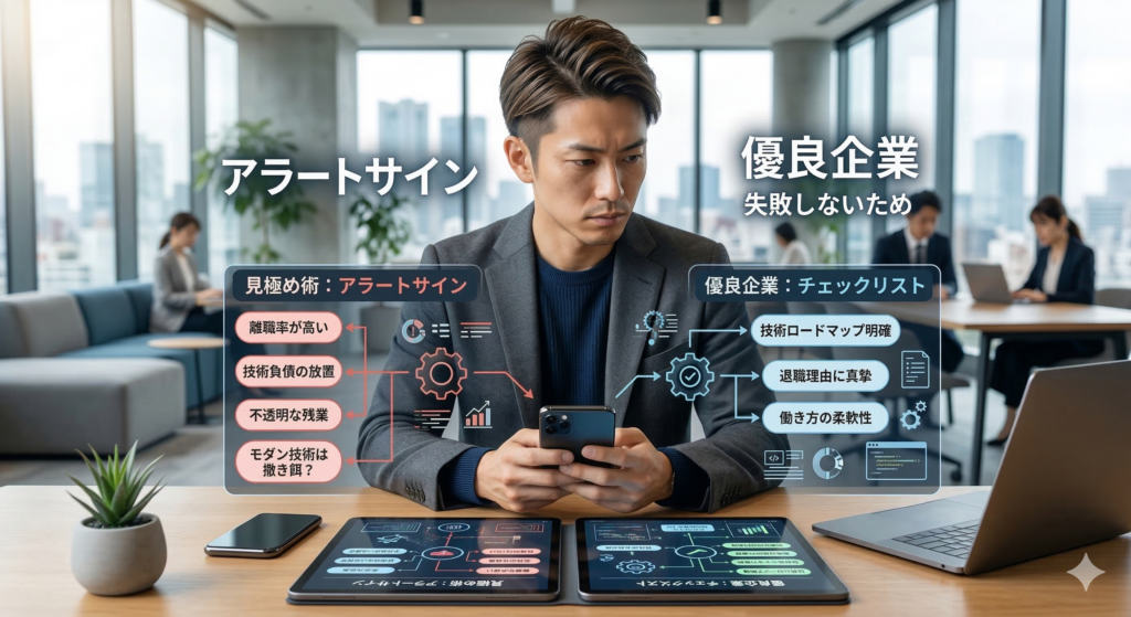 転職は、年収が上がれば成功というわけではありません。特に入社後のミスマッチや、いわゆる「モダンな技術を謳ったレガシー環境(ブラック現場)」に捕まってしまうことは、エンジニアのキャリアにとって致命的なタイムロスになります。エージェントを賢く利用して、これらのリスクを事前に排除する「目利き」の技術を身につけましょう。